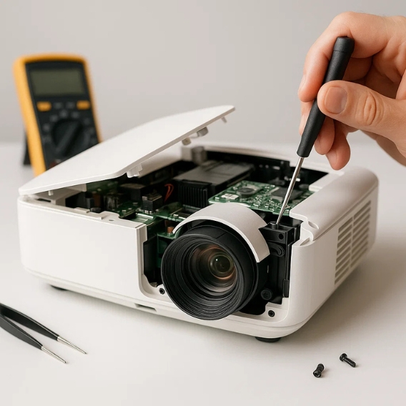 Image Suggestion: Repair tools beside an open projector, or a professional diagnosing the issue.